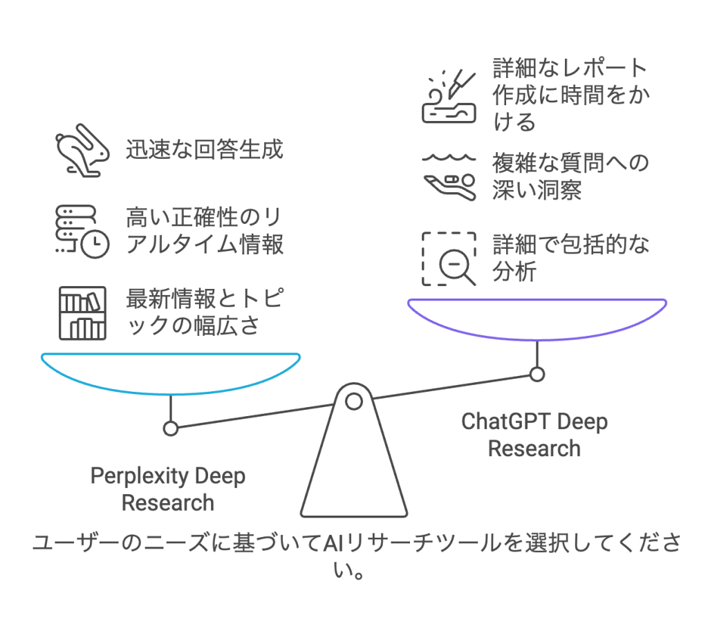 総合的に見ると、Perplexity Deep Researchは「ざっと概要を掴む」「数行の要約を得る」といった用途に適している一方、ChatGPT Deep Researchは「数十分かかってでも豊富なデータと分析結果をまとめたい」場合に適しています。ユーザーは自身のニーズや調査の性質に応じて、これらのツールを使い分けることが重要です。