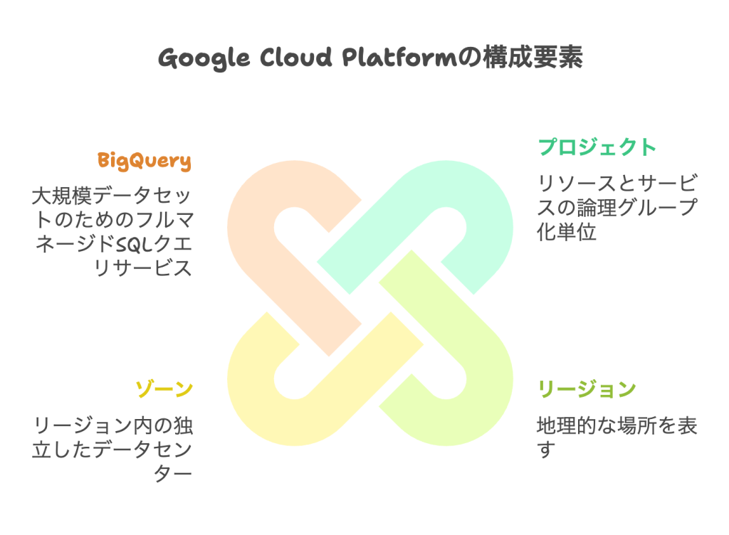 Google Cloud Platform (GCP) は、コンピューティング、ストレージ、ネットワーキング、ビッグデータ、機械学習など、幅広いクラウドサービスを提供しています。GCPの基本的な構成要素には、プロジェクト、リージョン、ゾーンがあります。プロジェクトは、リソースとサービスを論理的にグループ化する単位です。リージョンは地理的な場所を、ゾーンはリージョン内の独立したデータセンターを表します。