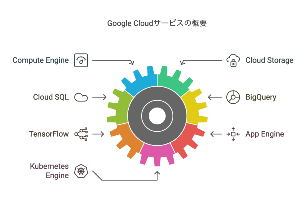 Google Cloudは、幅広い用途に対応する多様なサービスを提供しています。主要なサービスには、Compute Engine(仮想マシン)、Cloud Storage(オブジェクトストレージ)、Cloud SQL(リレーショナルデータベース)などがあります。これらのサービスは、企業や個人がハードウェアの設備や維持管理から解放され、インターネットを通じてITリソースを効率的に利用できるようにします。