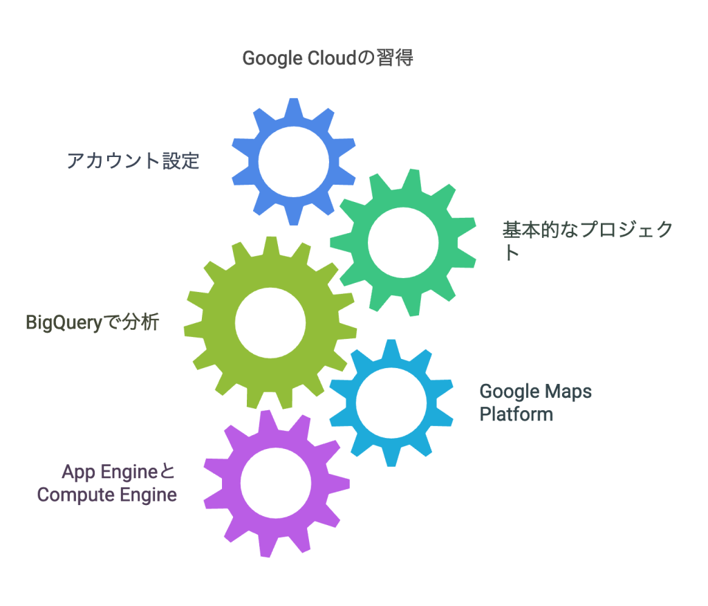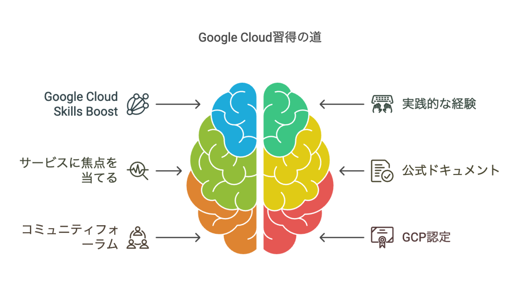 Google Cloudを効果的に使いこなすためには、段階的なアプローチが重要です。まず、Google Cloud Skills Boostを活用して基礎知識を身につけ、無料のトライアルクレジットを使って実践的な経験を積むことから始めましょう。次に、特定のサービス(例:Compute Engine、Cloud Storage)に焦点を当てて深く学び、実際のプロジェクトに適用していくことが効果的です。