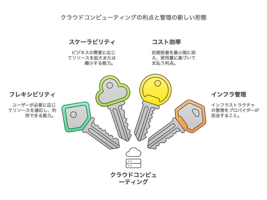 クラウドコンピューティングの主な利点には、柔軟性、スケーラビリティ、コスト効率が挙げられます。ユーザーは必要なリソースを必要な時に利用でき、使用量に応じて料金を支払うため、初期投資を抑えることができます。また、クラウドプロバイダーがインフラストラクチャの管理を担当するため、ユーザーは自社のコアビジネスに集中できるという利点もあります。
