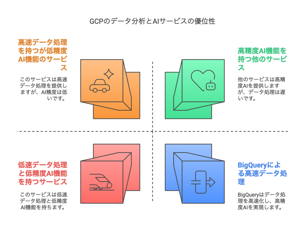 - データ分析・AI活用: GCPはBigQueryを中心とした高速データ処理基盤と、Googleの先端AI技術を活用できる点で優位性があります。
