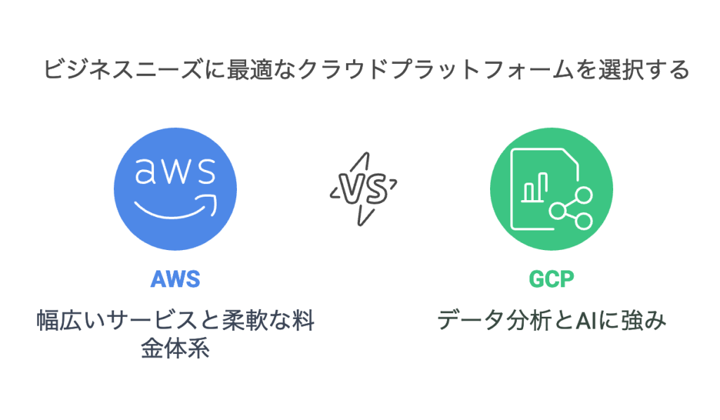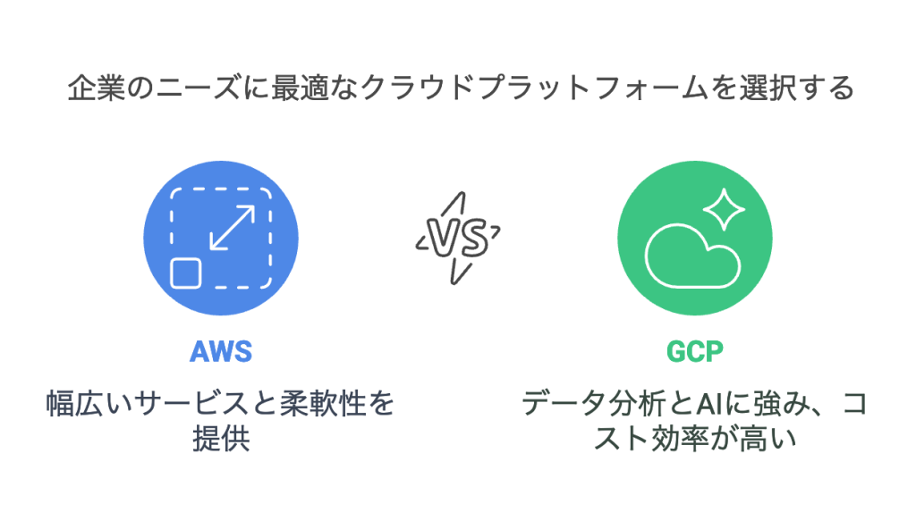 AWSとGCPの選択は、企業のニーズや技術要件に応じて慎重に行う必要があります。AWSは幅広いサービスと柔軟性を提供し、大規模なエンタープライズシステムや複雑な要件に適しています。一方、GCPはデータ分析とAIに強みを持ち、シンプルな操作性とコスト効率の高さが特徴です。
