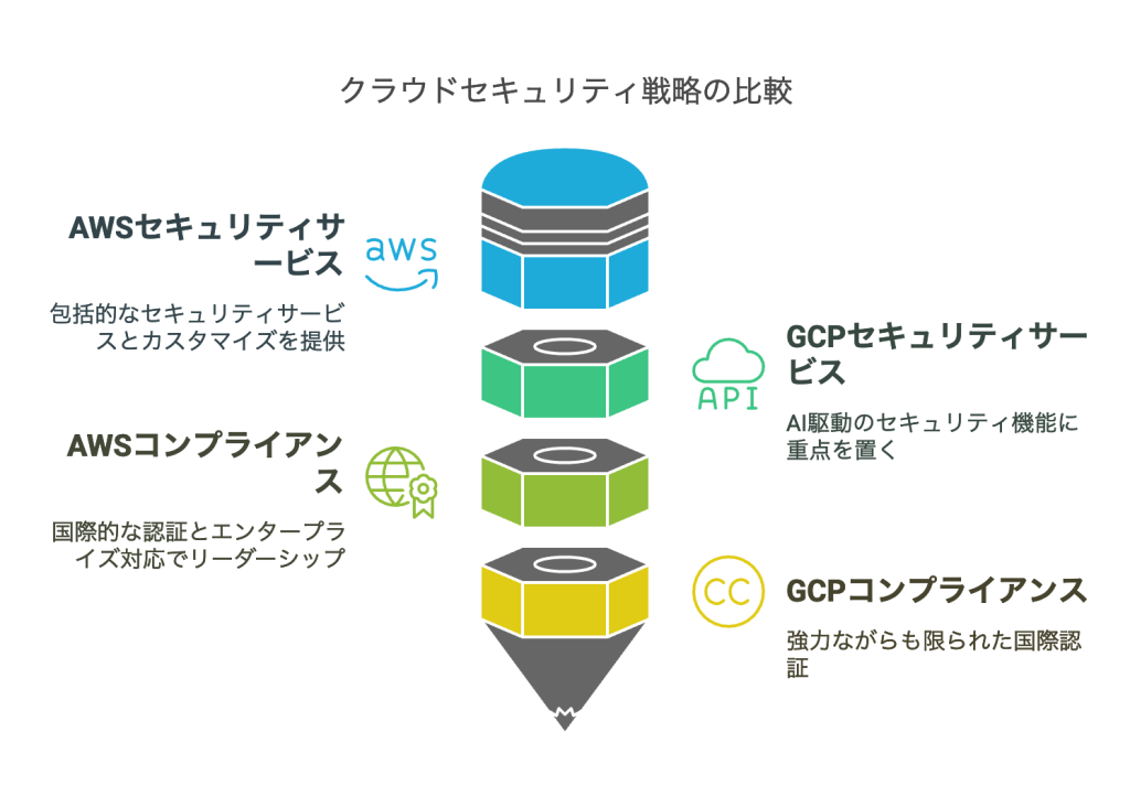 AWSとGCPは両者ともに高度なセキュリティ機能とコンプライアンス対応を提供していますが、アプローチに違いがあります。AWSは「責任共有モデル」を採用し、豊富なセキュリティサービスと柔軟なカスタマイズ性を特徴としています。一方、GCPは「ゼロトラスト」セキュリティモデルを採用し、高度なデータ分析とAIを活用したセキュリティ機能が強みです。