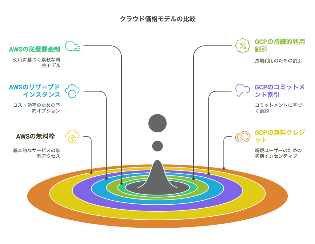 AWSとGCPの価格モデルには、いくつかの重要な違いがあります。AWSは従量課金制を採用し、使用したリソースに応じて料金が発生します。一方、GCPは持続的利用割引を提供し、長期的な利用に対してより大きな割引を適用します。