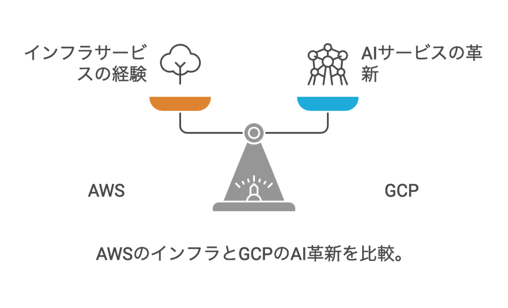 AWSとGCPは、両者ともに幅広いクラウドサービスを提供していますが、それぞれに特徴的な強みがあります。AWSは豊富な経験と多様なサービスラインナップを誇り、特にEC2(仮想サーバー)やS3(ストレージ)などの基本的なインフラサービスが充実しています。一方、GCPはデータ分析とAIに強みを持ち、BigQueryやVertex AIなどの先進的なサービスを提供しています。