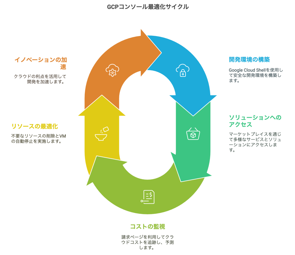GCPコンソールは、クラウド開発を効率化し、コスト最適化を実現するための強力なツールです。開発者は、Google Cloud Shellを活用して、セキュアな開発環境を手軽に構築できます。また、マーケットプレイスを通じて、多様なソリューションやサービスに簡単にアクセスし、迅速にデプロイすることが可能です。