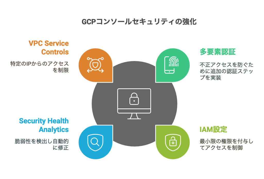 GCPコンソールのセキュリティを強化するには、以下の重要なポイントに注意する必要があります: