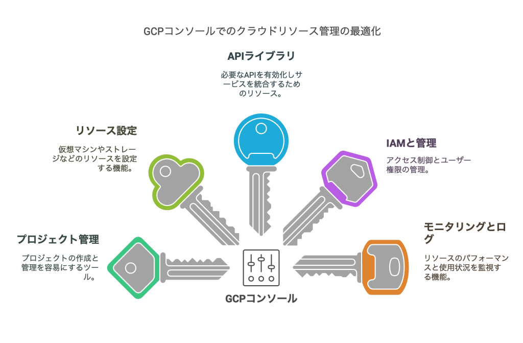 GCPコンソールは、クラウドリソースの効率的な管理と最適化を支援し、初心者からエキスパートまで幅広いユーザーに対応する直感的なインターフェースを提供します。