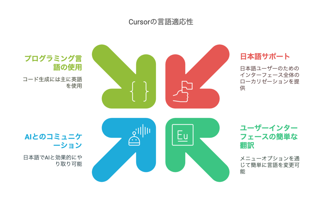 これらの設定により、日本語ユーザーはCursorの機能をより直感的に使いこなし、AIアシスタントとのスムーズなコミュニケーションを通じてコーディング効率を向上させることができます。