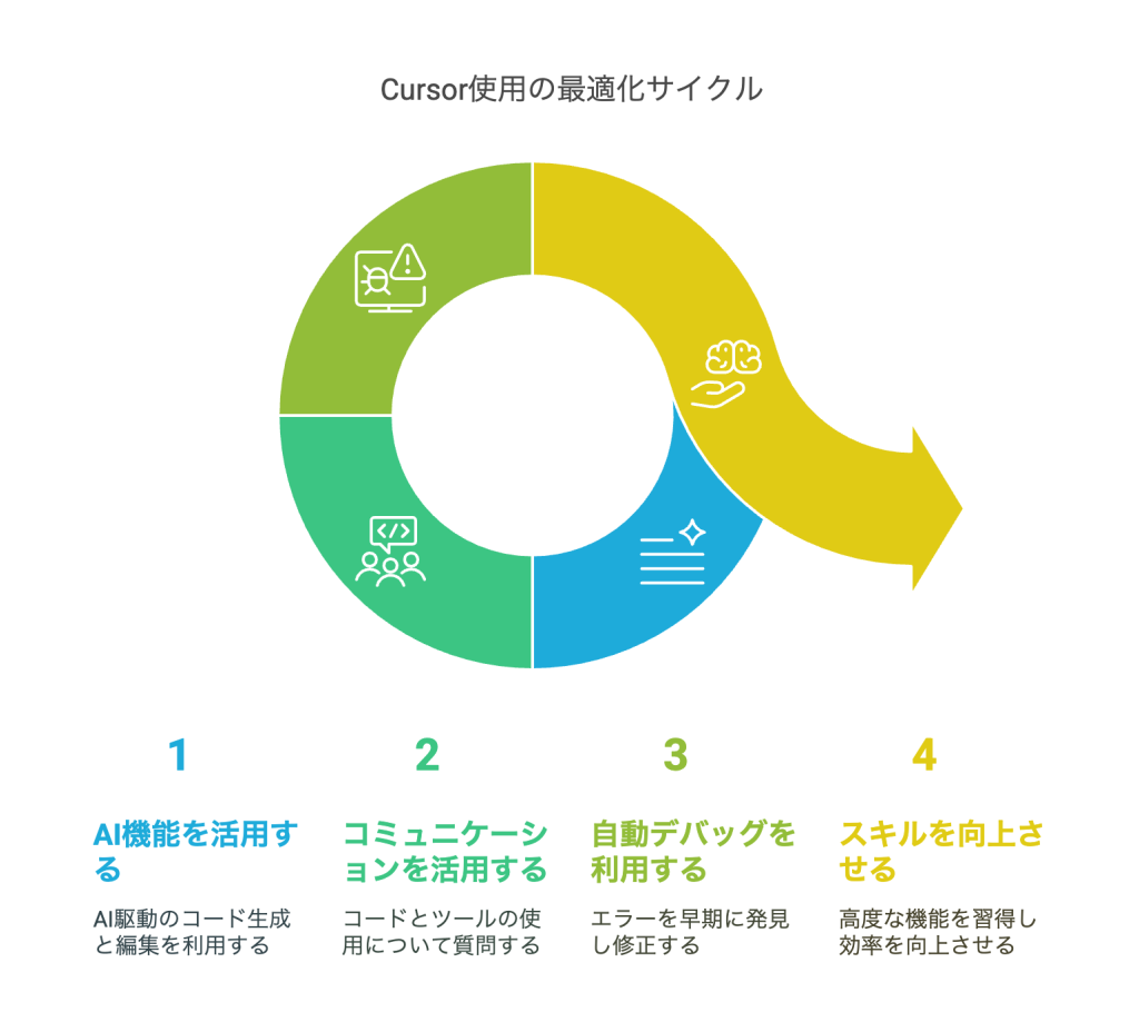 - 継続的な学習と実践を通じて、Cursorの高度な機能を習得し、開発効率をさらに向上させる