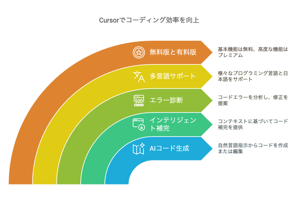 Cursorは、AIの力を活用して開発者の生産性を大幅に向上させる革新的なツールです。コードの自動生成、インテリジェントな補完、エラー診断など、多彩な機能を通じてコーディングプロセスを効率化します。日本語対応により、国内の開発者も直感的に操作できるようになりました。以下の点に注目して、Cursorを最大限に活用しましょう: