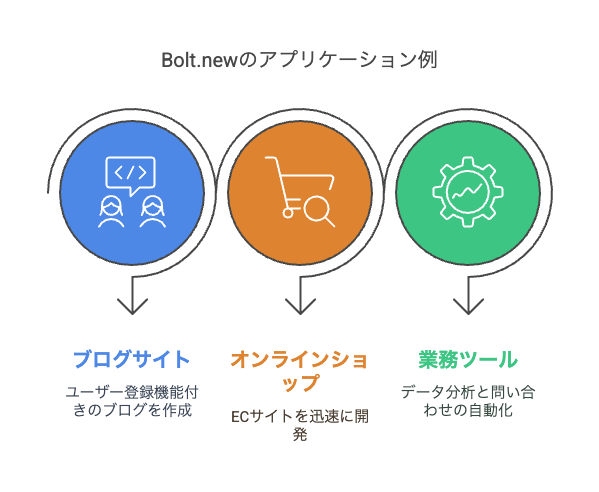 Bolt.newを活用することで、プログラミングスキルがなくても様々なアプリケーションを効率的に開発できます。自然言語での指示だけでフルスタックアプリケーションを開発できる特性を活かした実例として、以下のような活用事例が挙げられます: