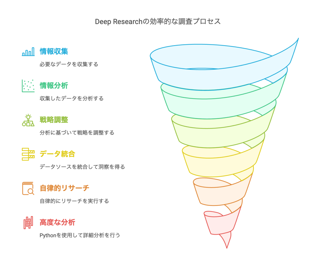 これらの特徴により、Deep Researchは単なる情報検索を超え、高品質で信頼性の高いレポートを短時間で生成することが可能となり、リサーチ業務の効率と質を大幅に向上させています。