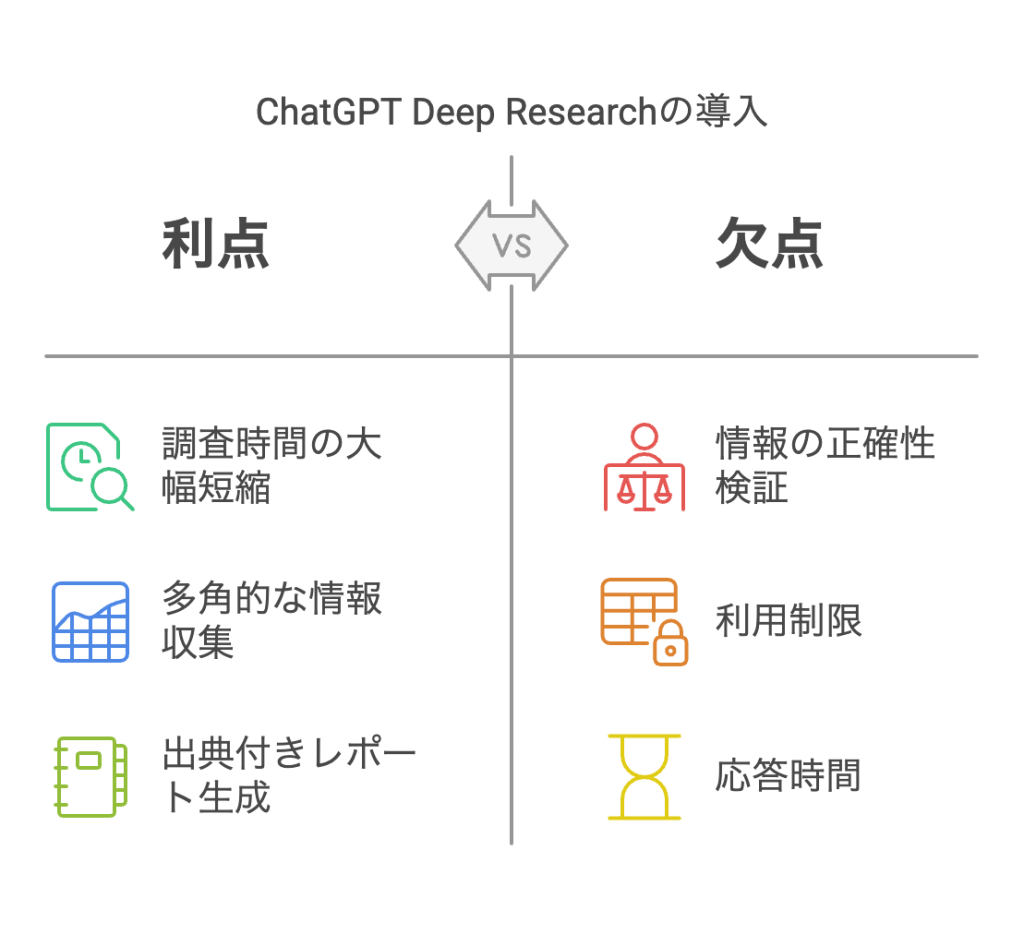 ChatGPT Deep Researchの導入には、リサーチ業務を劇的に効率化するメリットがある一方で、いくつかの注意点も存在します。