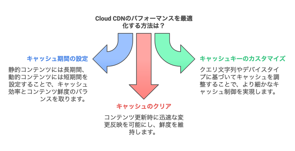 さらに、Cloud CDNではキャッシュキーのカスタマイズが可能で、より細かなキャッシュ制御を行えます。クエリ文字列の含める/除外する設定や、デバイスタイプに応じたキャッシュなど、ユースケースに合わせた最適化が可能です。また、CDNキャッシュのクリア機能を活用することで、コンテンツの更新時に迅速に反映させることができます。これらの設定を適切に行うことで、Cloud CDNのパフォーマンスを最大化し、ユーザーへの高速なコンテンツ配信を実現できます。