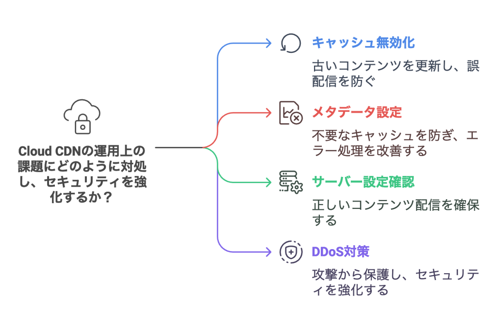 Cloud CDNの運用では、いくつかの一般的な課題に直面することがあります。404エラーのキャッシュや非公開コンテンツの誤配信などの問題が発生した場合、迅速な対応が必要です。これらの問題に対処するには、以下の方法が効果的です: