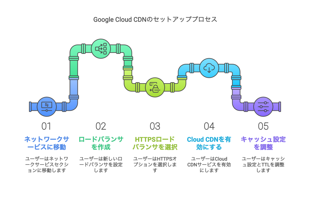 Cloud CDNの導入は、Google Cloud Consoleを通じて簡単に行えます。基本的な手順は以下の通りです: