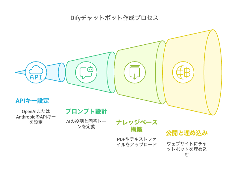 Difyを使えば技術的な知識がなくても直感的な操作だけで高機能なAIチャットボットを短時間で構築できます。プログラミングやサーバー設定などの複雑な作業は必要なく、シンプルなステップでビジネス課題を解決するチャットボットを作成できます。このセクションでは、アカウント開設から初期設定、プロンプト設計、ナレッジベース構築、そして最終的なウェブサイトへの埋め込みまでの具体的な手順を解説します。これらのステップを順番に進めることで、AIの専門知識がなくても最短数時間でAIチャットボットを公開できるようになります。