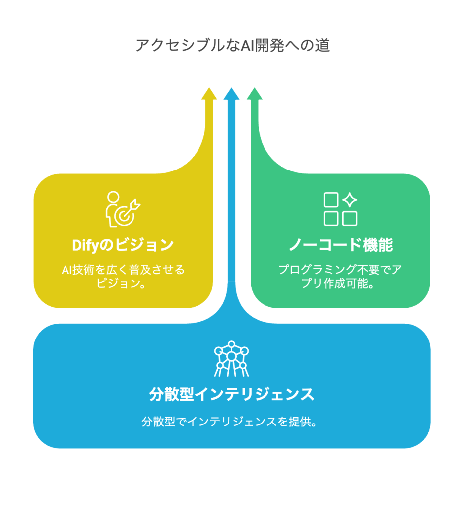 Difyは「ディファイ」と読みます。この名称は"Decentralized Intelligence For You"(あなたのための分散型インテリジェンス)の略称であり、AIアプリケーション開発を民主化する目的を反映しています。Difyは、ノーコード開発の概念を取り入れ、プログラミングの専門知識がなくてもAIアプリケーションを作成できるプラットフォームとして設計されています。この特徴により、Difyは従来のソフトウェア開発の障壁を取り除き、より多くの人々がAI技術を活用できるようにすることを目指しています。
