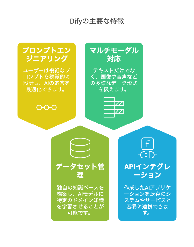 これらの機能により、Difyはプログラミング経験の有無に関わらず、ユーザーが高度なAIアプリケーションを効率的に開発し、ビジネスや個人のニーズに合わせたソリューションを提供することを可能にしています。