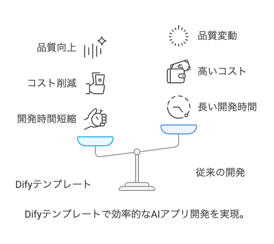 Difyテンプレートの導入は、AIアプリケーション開発における時間と労力の大幅な削減をもたらし、結果として開発チーム全体の生産性と成果物の品質を向上させます。