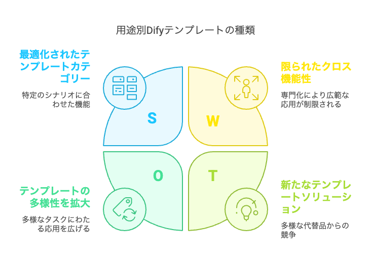 Difyプラットフォームが提供するテンプレートは、開発目的や用途によって最適化された構成となっており、企業や個人が目的に合わせて効率的にAIアプリケーションを構築できる環境を整えています。各カテゴリーのテンプレートは特定のシナリオに特化しており、開発者はニーズに合わせて適切なテンプレートを選択することで、開発プロセスを劇的に効率化できます。