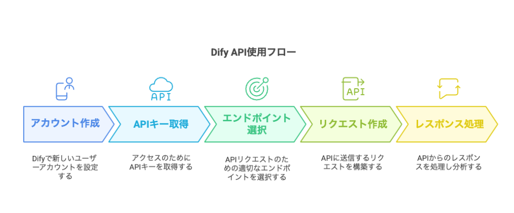 Dify APIの使用プロセスは、5つの主要ステップで構成されています。この流れを理解することがDify APIを効果的に活用する第一歩となります。