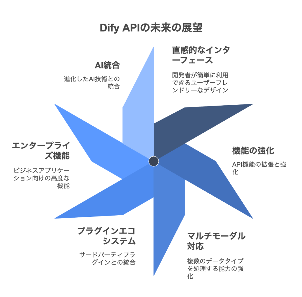 Dify APIは、AIアプリケーション開発の民主化を促進し、革新的なソリューションの創出を加速させています。その直感的なインターフェースと豊富な機能により、開発者はより迅速かつ効率的にAIの力を活用できるようになりました。今後、Difyはマルチモーダル対応やプラグインエコシステムの拡充を通じて、さらに多様なユースケースに対応していく見込みです。