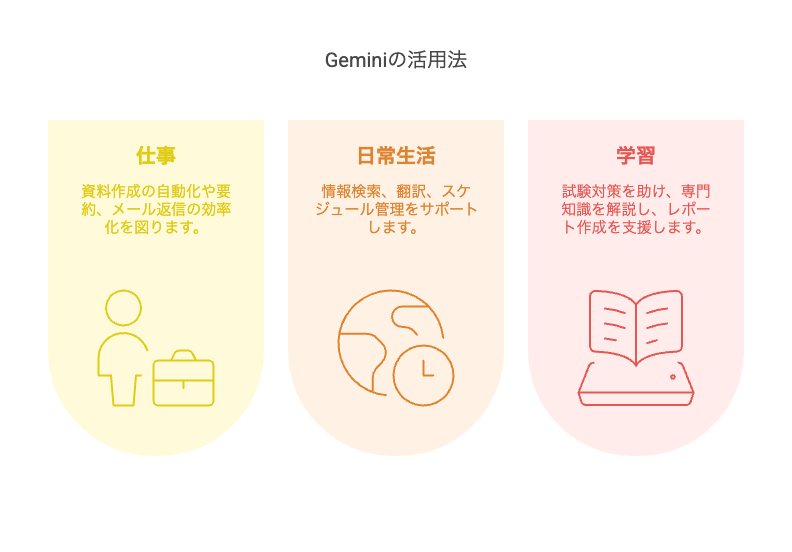 Geminiは単なる会話ツールではなく、仕事の効率化、日常生活のサポート、学習支援まで幅広く活用できる多機能AIです。特にGoogleのサービス群と連携することで、これまで手作業で行っていた多くのタスクを自動化し、時間と労力を大幅に節約できます。ここでは、すぐに実践できる具体的な活用術を仕事・日常・学習の3分野に分けて紹介します。