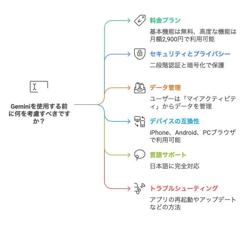 Geminiを実際に活用する前に、料金プランやセキュリティ、よくある疑問点について押さえておくと安心です。初めてAIツールを使う方にありがちな不安や疑問を解消し、より快適にGeminiを使いこなすための基礎知識を解説します。ここでは特に初心者が気になりやすいポイントに焦点を当て、安心してスタートできるよう必要な情報をまとめました。