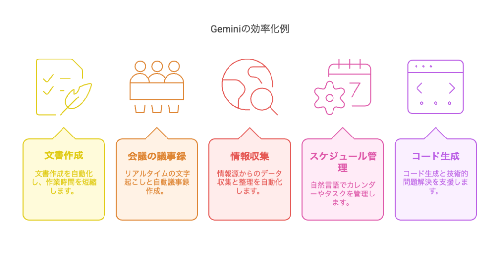 Geminiの基本機能を理解したところで、実際にどのように業務に活用できるのかを見ていきましょう。日常業務の中で特に時間がかかるタスクを効率化できる5つの具体例を紹介します。これらは特別な設定やスキルがなくても、すぐに実践できる方法ばかりです。導入障壁が低いため、AIツール初心者でも安心して始められます。