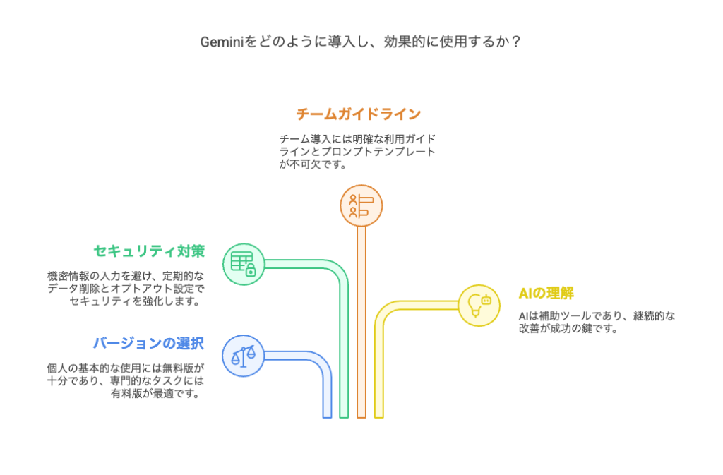 Geminiをチームで効果的に活用するためには、個人利用とは異なる運用ルールと設定が必要であり、組織的なアプローチによって業務品質の向上と効率化を両立させることができます。