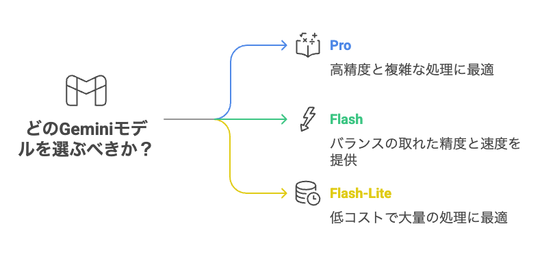 - 高速処理や大量データが必要な自動化・チャットにはFlashまたはFlash-Liteモデル