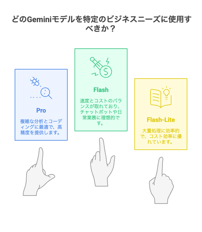 モデル選択の結論は以下の通りです。複雑な分析や専門的なコーディングが必要な業務にはProが最適で、チャットボットや日常業務の自動化にはFlashが効率的、大量データ処理やコスト重視の用途にはFlash-Liteが最適解となります。