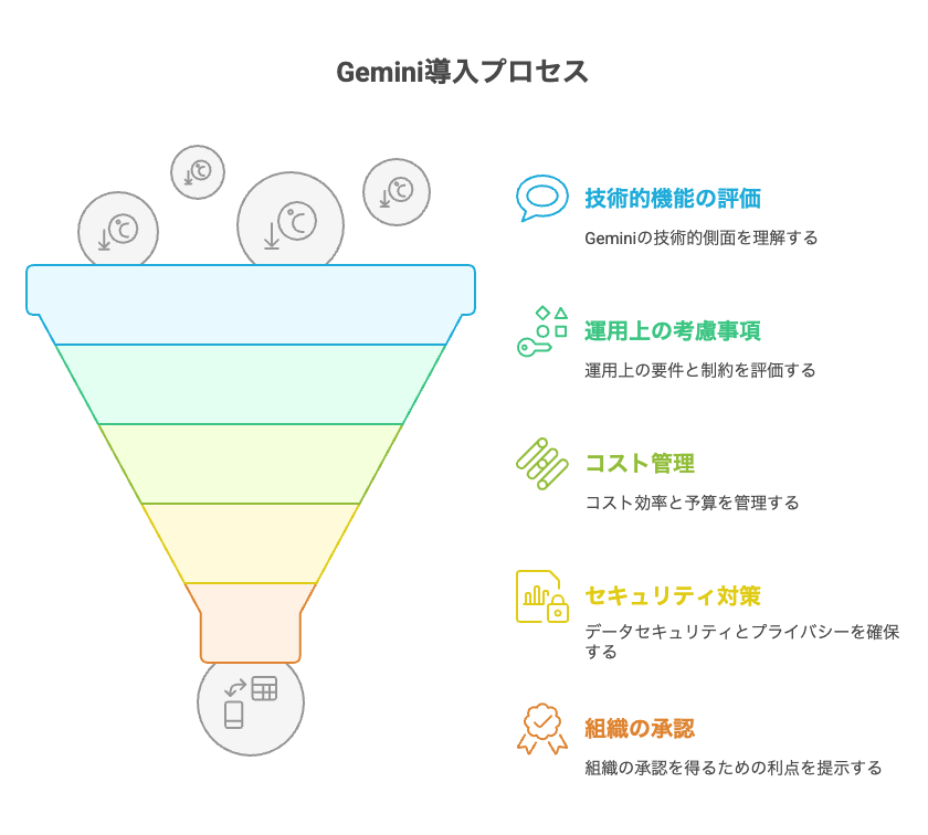 Gemini導入の成功は、技術的な機能比較だけでなく、運用面での注意点と組織内での合意形成を適切に進められるかにかかっています。