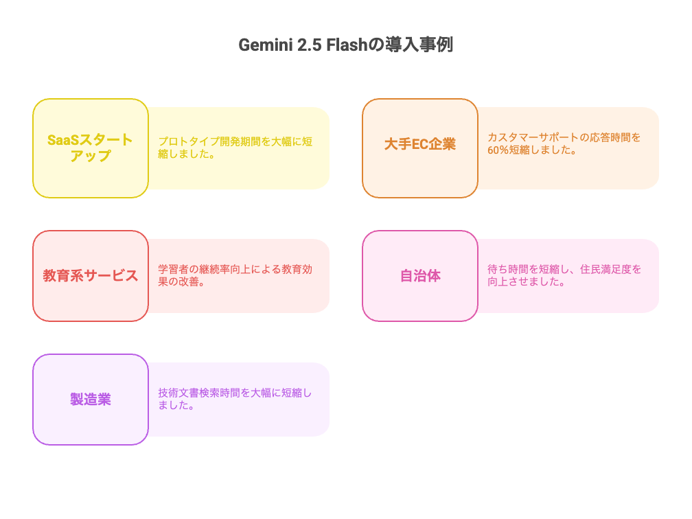 実際の導入企業が直面していた具体的な課題と、それをどのようにGemini 2.5 Flashで解決したかを知ることで、自社での活用可能性を具体的に判断できます。ここでは、業界を横断した5つの実践事例を通じて、Gemini 2.5 Flashの実力と効果的な活用方法を明らかにします。