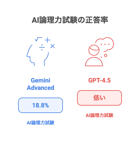 2025年3月に発表された最新モデル「Gemini 2.5 Pro」がGemini Advancedに導入されました。このモデルは「Humanity's Last Exam」というAI論理力試験で18.8%の正答率を達成し、競合のGPT-4.5(6.4%)を大きく上回る性能を発揮しています。
