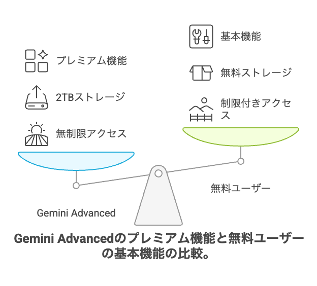 無料版Gemini無料・基本的なAI機能<br>・Deep Research機能(毎月数回のみ)<br>・ストレージ増量なし2025年3月から一部機能開放