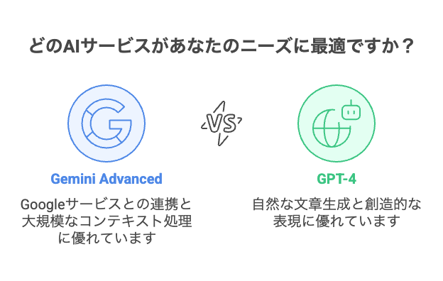Gemini AdvancedとGPT-4の主要な違いを把握することで、あなたの目的に最適なAIを選択するための基準が明確になります。両者はそれぞれ異なる特性と得意分野を持ち、使用目的によって選ぶべきAIが変わってきます。