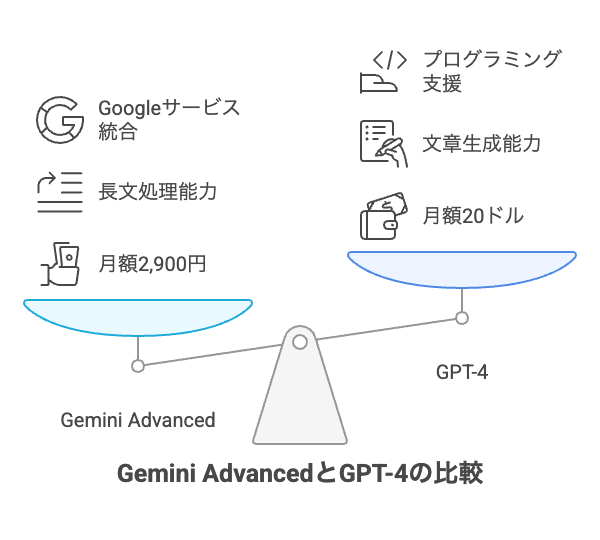 | 独自機能 | Deep Research、Veo 2、Gems | GPT Store、DALL-E 3、Code Interpreter |