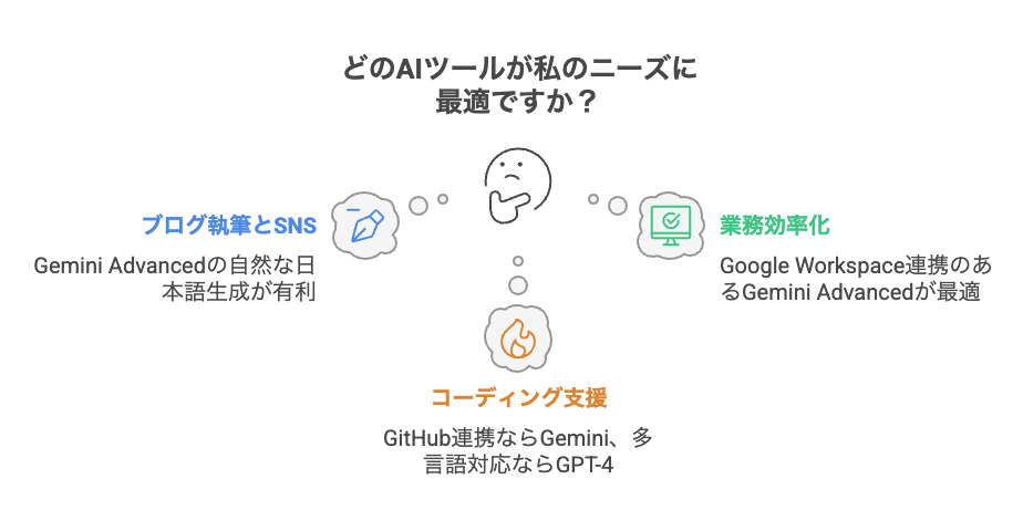 AIツールの真価は、あなたの具体的な目的に対してどれだけ効果的に機能するかにあります。Gemini AdvancedとGPT-4は、それぞれ異なる場面で優位性を持っています。ここでは、用途別に最適なAIを選ぶためのガイドを提供し、あなたの活動や業務に最も適したツール選びをサポートします。