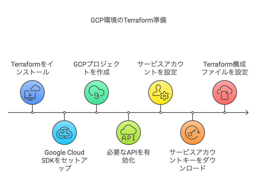 GCP環境構築のためのTerraform準備には、以下のツールと設定が必要です: