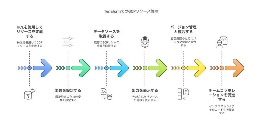 このプロセスにより、コードでGCPリソースを管理し、一貫性のある再現可能な環境を構築できます。変数を使用することで、異なる環境(開発、ステージング、本番)に対して同じコードを柔軟に適用することが可能です。
