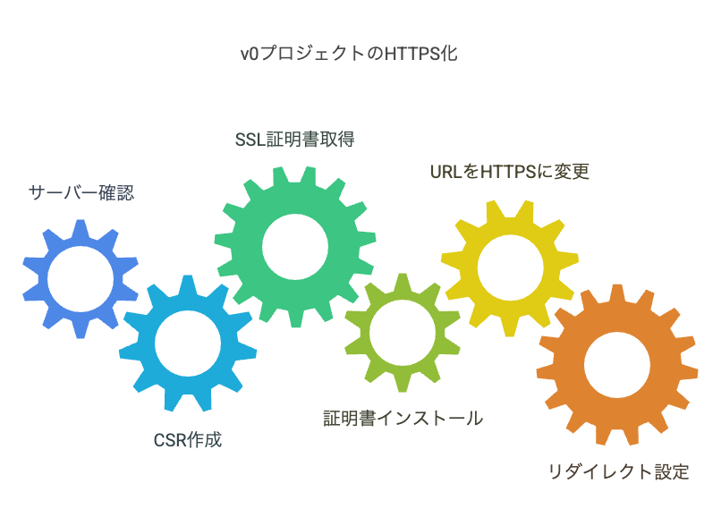 HTTPS化の手順は一般的に、サーバーの対応確認、CSR作成、SSL証明書の取得とインストール、URLのHTTPS変更、リダイレクト設定の順で行います。v0プロジェクトの場合、多くの作業が自動化されていますが、DNSレコードの設定やドメインの追加は手動で行う必要があります。また、ドメインを変更または廃止する際は、セキュリティリスクを避けるため慎重に対応しましょう。